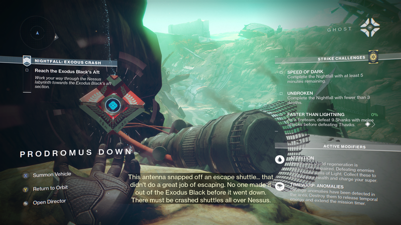 Ghost: "This antenna snapped off an escape shuttle... that didn't do a great job of escaping. No one made it out of the Exodus Black before it went down. There must be crashed shuttles all over Nessus."