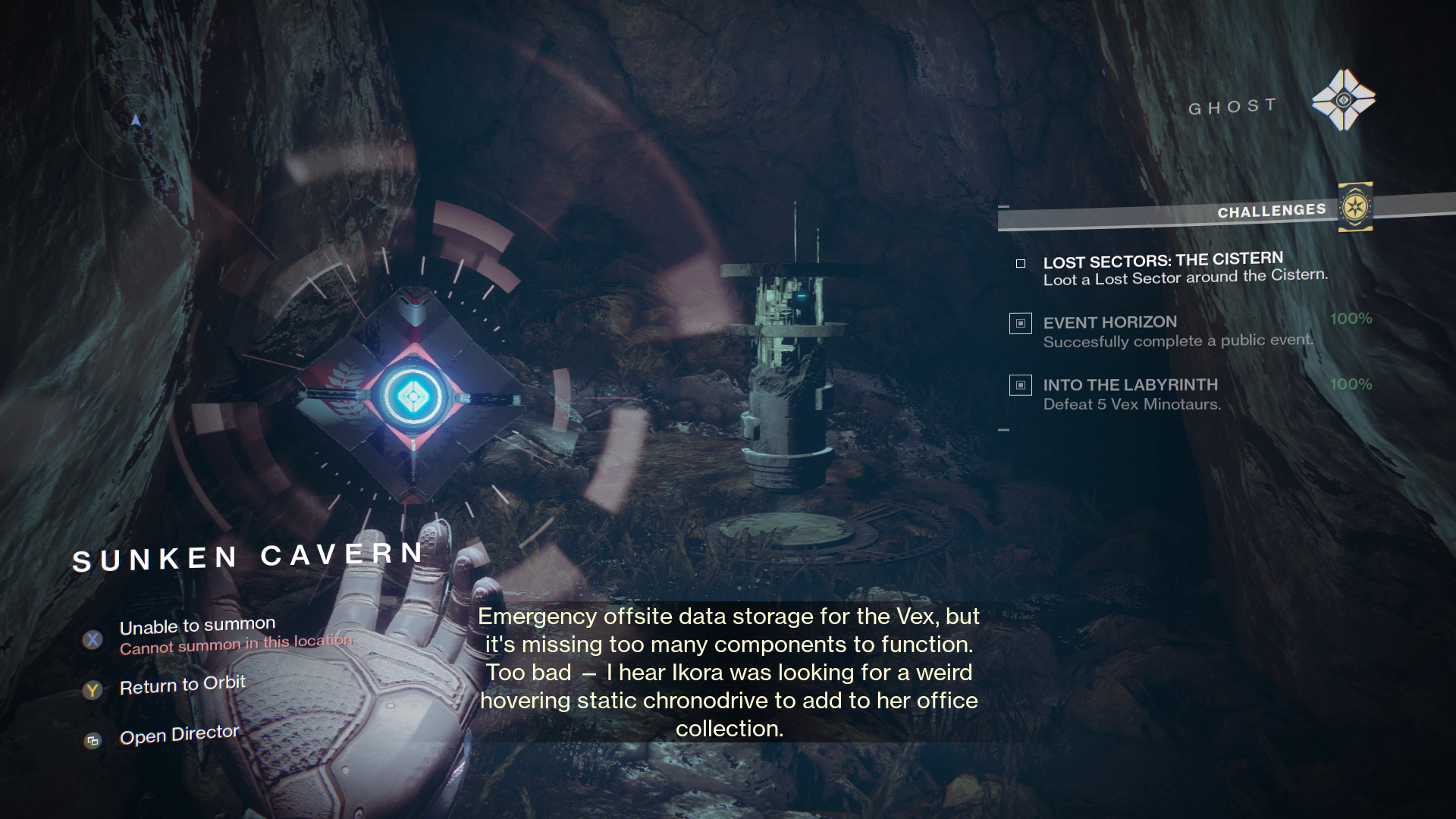 Ghost: "Emergency offsite data storage for the Vex, but it's missing too many components to function. Too bad - I hear Ikora was looking for a weird hovering static chronodrive to add to her office collection."