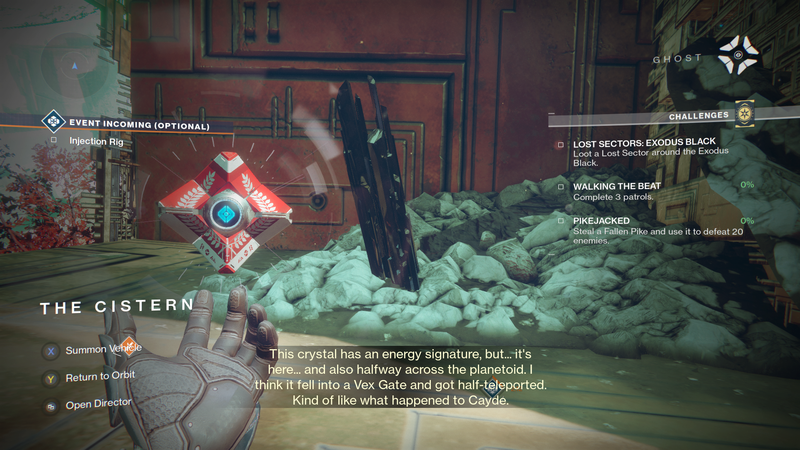 Ghost: "This crystal has and energy signature, but... its here... and also halfway across the planetoid. I think it fell into a Vex Gate and got half-teleported. Kind of like what happened to Cayde."