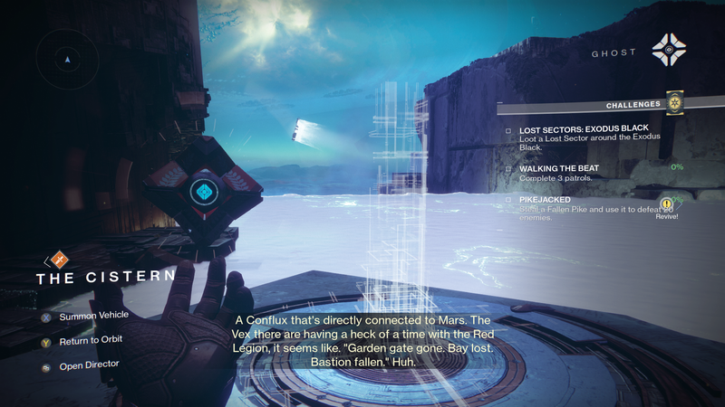 Ghost: "A Conflux that's directly connected to Mars. The Vex there are having a heck of a time with the Red Legion, it seems like: 'Garden Gate gone. Bay lost. Bastion fallen.' Huh."