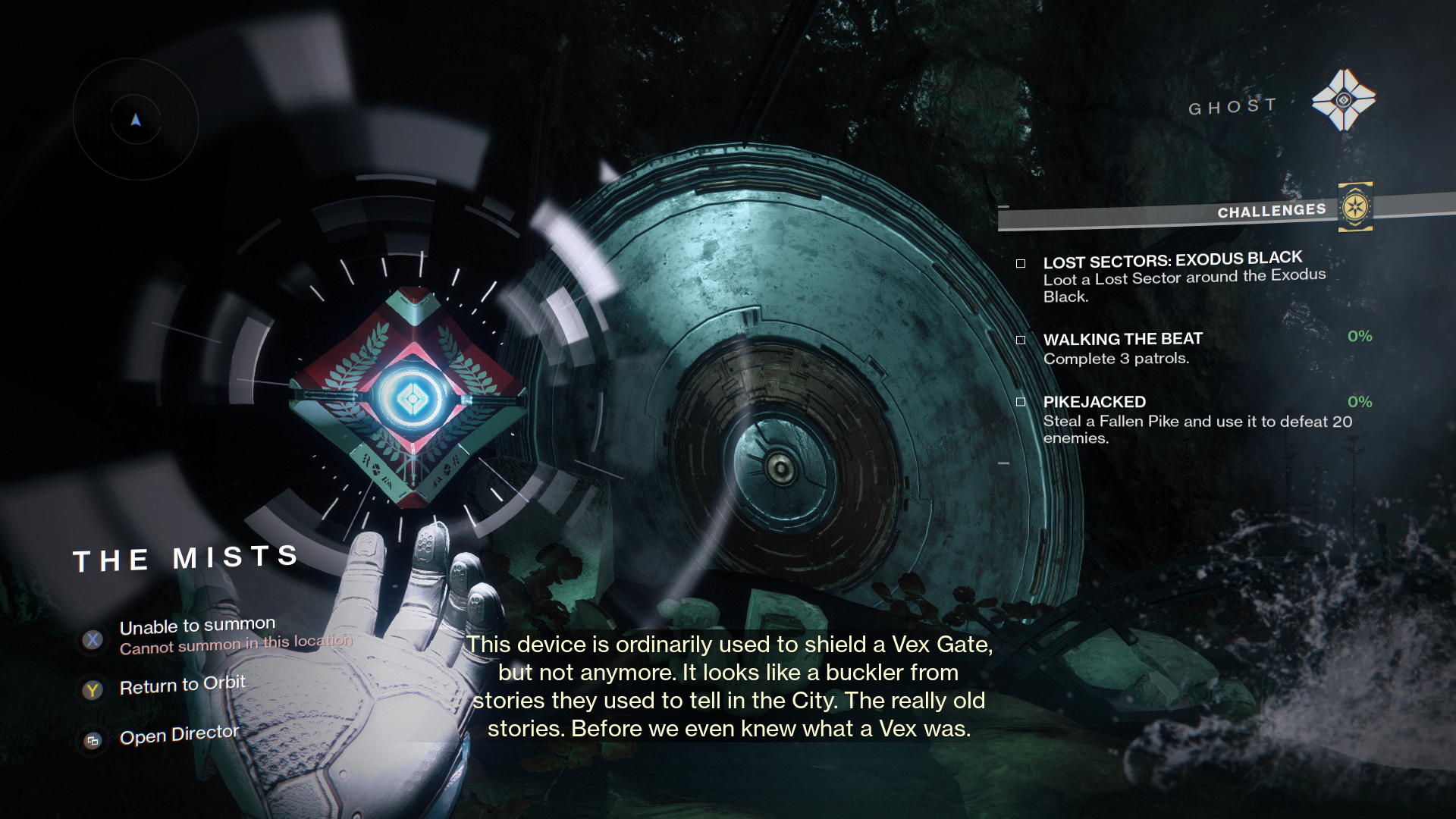 | current | 05:41, September 14, 2017 | 1,920 × 1,080 (2.84 MB) | KFC just (talk | contribs) | Ghost: "This device is ordinarily used to shield a Vex Gate, but not anymore. It looks like a buckler from the stories they used to tell in the City. The really old stories. Before we even knew what a Vex was." |
