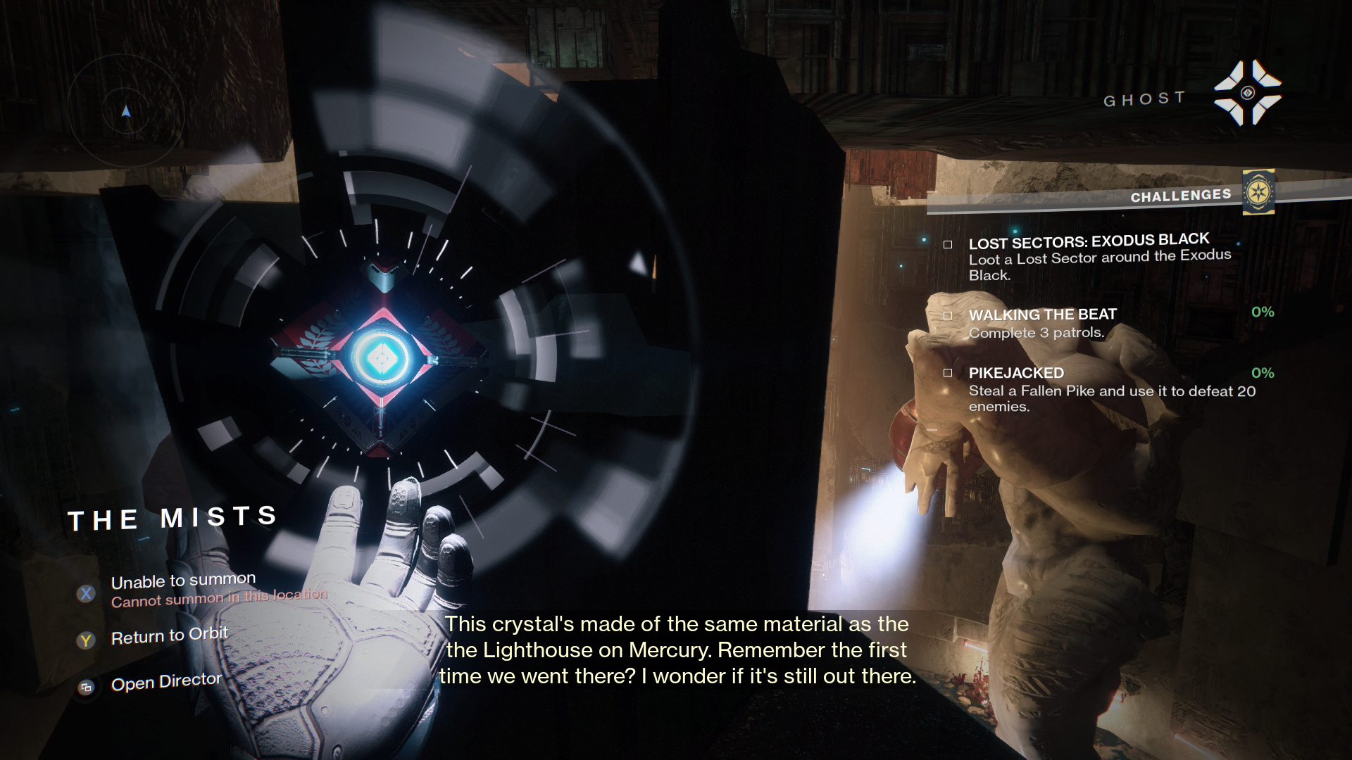 Ghost: "This crystal is made of the same material as the Lighthouse on Mercury. Remember the first time we went there? I wonder if it's still out there."