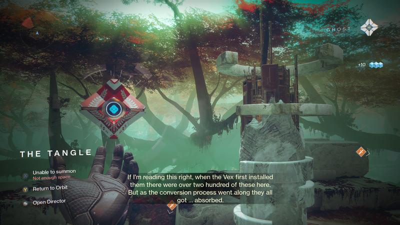 Ghost: "If I'm reading this right, when the Vex first installed them there were over two hundred of these here. But as the conversion process went along, they all got... absorbed."