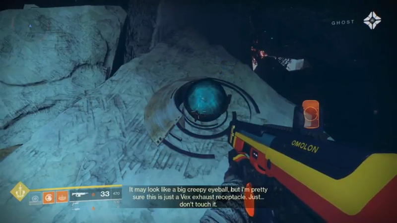 | current | 22:16, November 22, 2017 | 1,366 × 768 (1.73 MB) | KFC just (talk | contribs) | '''Non-Veteran Version''' Ghost: It may look like a big creepy eyeball, but I’m pretty sure this is just a Vex exhaust receptacle. Just… Don’t touch it. |