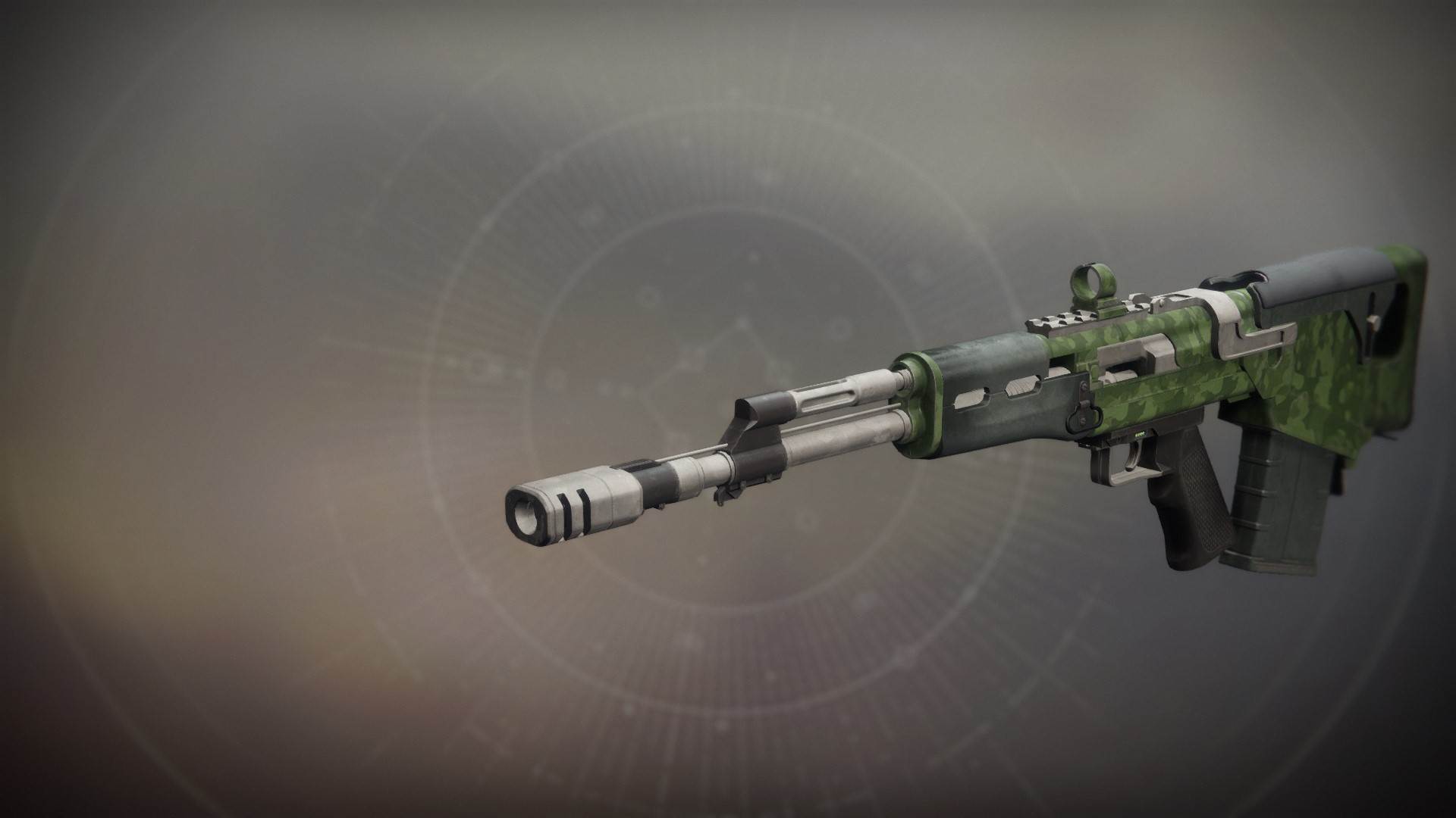 This image is a screenshot of a weapon from the Destiny series of first-person shooter video games developed by Bungie Studios and published by Bungie or Activision. It falls under the screenshot category for a copyrighted computer game or video game, and the copyright for it is most likely held by the company that developed the game. It is believed that the use of a limited number of web-resolution screenshots: