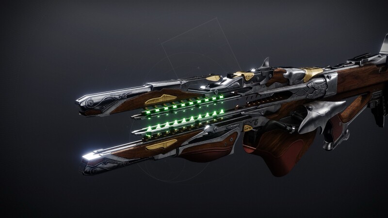 This image is a screenshot of a weapon from the Destiny series of first-person shooter video games developed by Bungie Studios and published by Bungie or Activision. It falls under the screenshot category for a copyrighted computer game or video game, and the copyright for it is most likely held by the company that developed the game. It is believed that the use of a limited number of web-resolution screenshots: