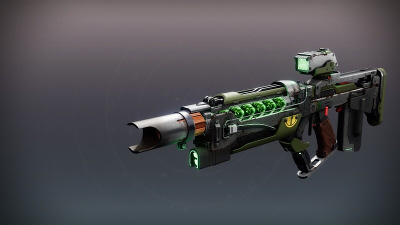 This image is a screenshot of a weapon from the Destiny series of first-person shooter video games developed by Bungie Studios and published by Bungie or Activision. It falls under the screenshot category for a copyrighted computer game or video game, and the copyright for it is most likely held by the company that developed the game. It is believed that the use of a limited number of web-resolution screenshots: