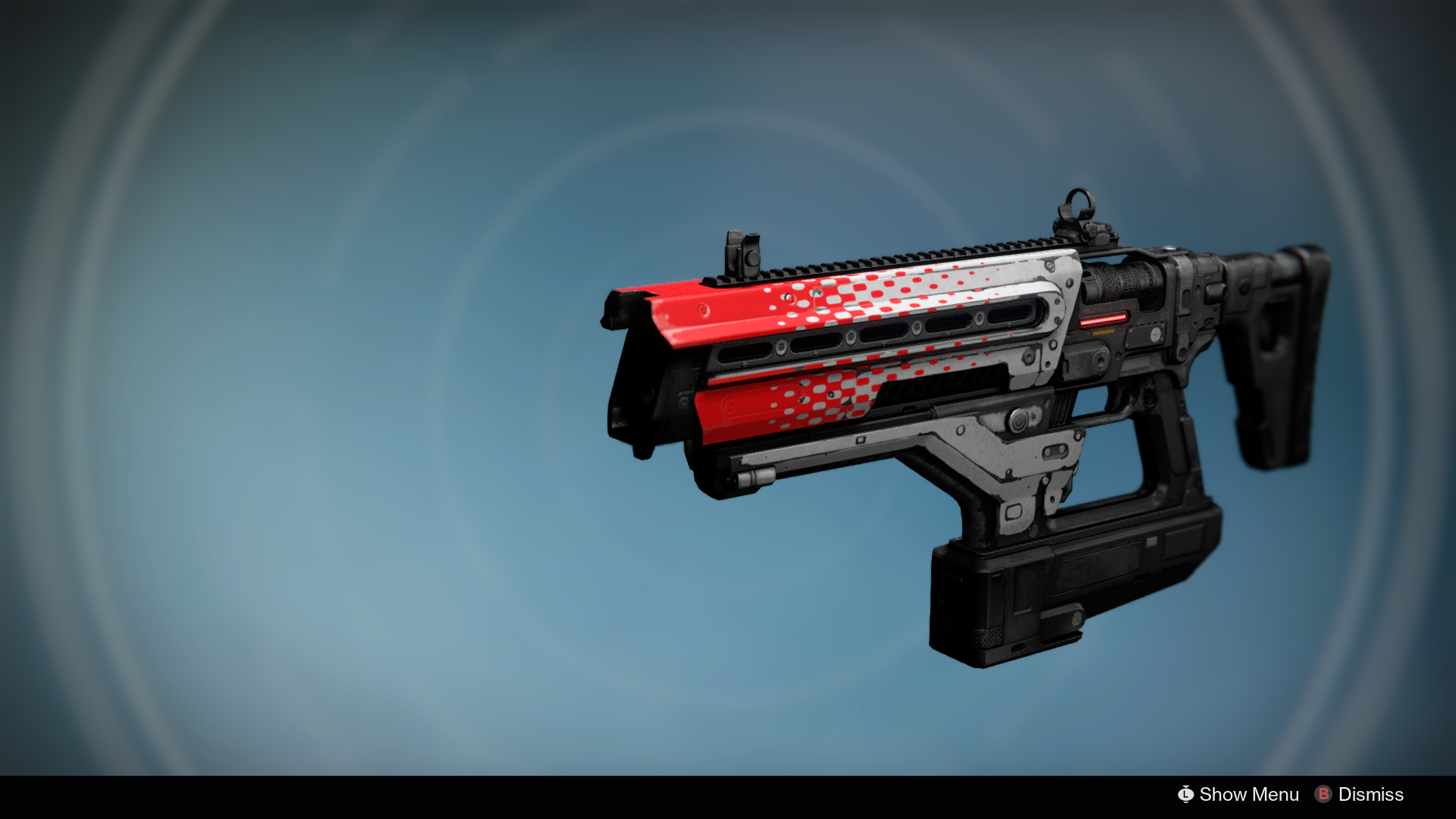 This image is a screenshot of a weapon from the Destiny series of first-person shooter video games developed by Bungie Studios and published by Bungie or Activision. It falls under the screenshot category for a copyrighted computer game or video game, and the copyright for it is most likely held by the company that developed the game. It is believed that the use of a limited number of web-resolution screenshots: