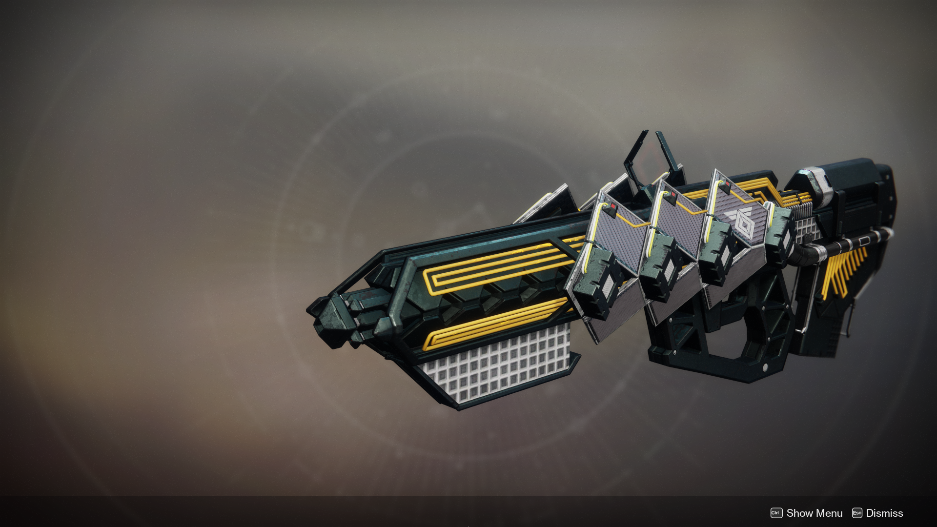 This image is a screenshot of a weapon from the Destiny series of first-person shooter video games developed by Bungie Studios and published by Bungie or Activision. It falls under the screenshot category for a copyrighted computer game or video game, and the copyright for it is most likely held by the company that developed the game. It is believed that the use of a limited number of web-resolution screenshots: