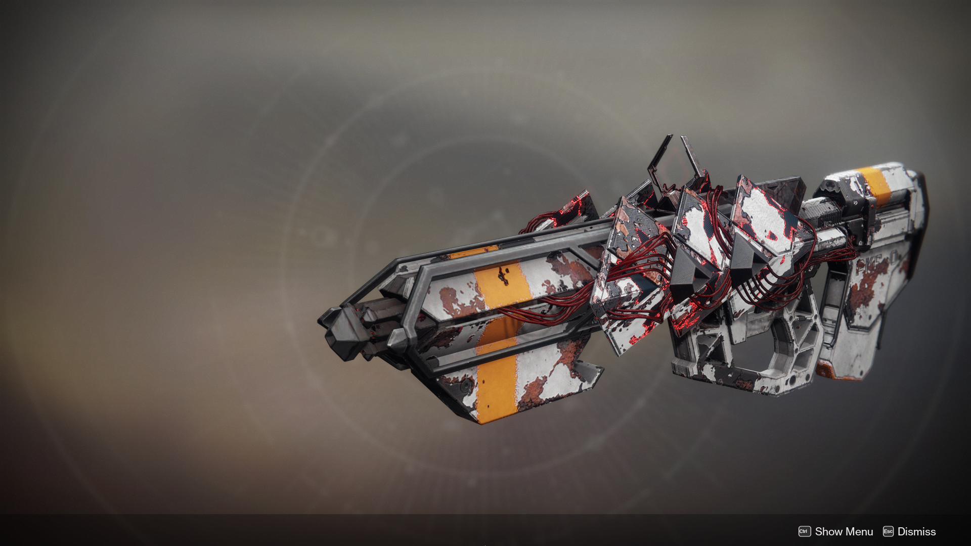This image is a screenshot of a weapon from the Destiny series of first-person shooter video games developed by Bungie Studios and published by Bungie or Activision. It falls under the screenshot category for a copyrighted computer game or video game, and the copyright for it is most likely held by the company that developed the game. It is believed that the use of a limited number of web-resolution screenshots: