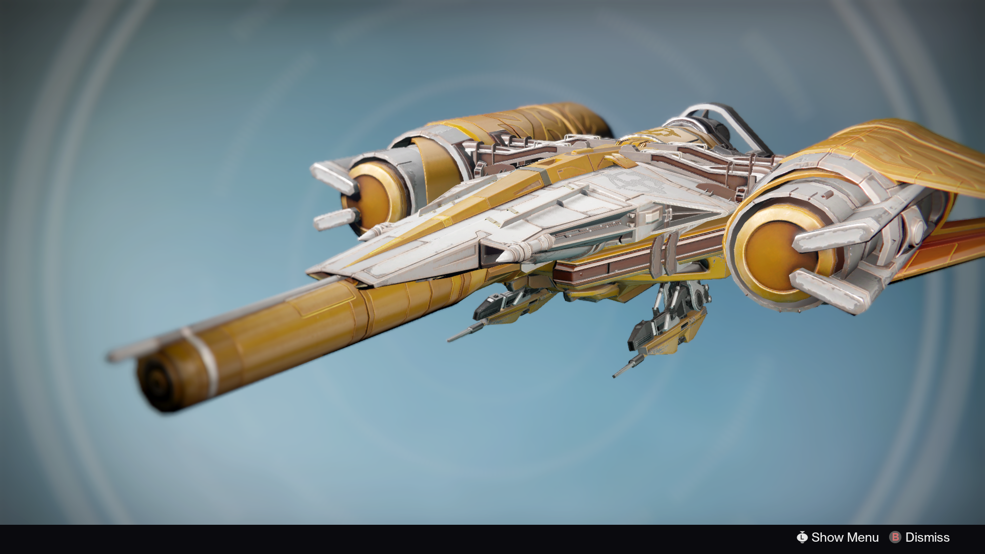 This image is a screenshot of a vehicle from the Destiny series of first-person shooter video games developed by Bungie Studios and published by Bungie or Activision. It falls under the screenshot category for a copyrighted computer game or video game, and the copyright for it is most likely held by the company that developed the game. It is believed that the use of a limited number of web-resolution screenshots: