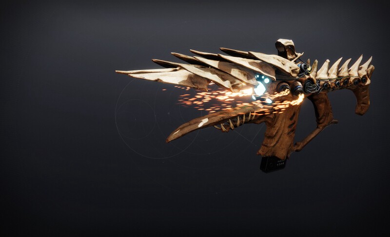 This image is a screenshot of a weapon from the Destiny series of first-person shooter video games developed by Bungie Studios and published by Bungie or Activision. It falls under the screenshot category for a copyrighted computer game or video game, and the copyright for it is most likely held by the company that developed the game. It is believed that the use of a limited number of web-resolution screenshots:
