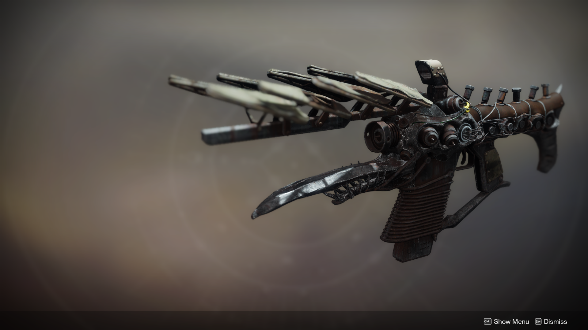 This image is a screenshot of a weapon from the Destiny series of first-person shooter video games developed by Bungie Studios and published by Bungie or Activision. It falls under the screenshot category for a copyrighted computer game or video game, and the copyright for it is most likely held by the company that developed the game. It is believed that the use of a limited number of web-resolution screenshots: