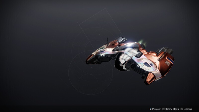 This image is a screenshot of a vehicle from the Destiny series of first-person shooter video games developed by Bungie Studios and published by Bungie or Activision. It falls under the screenshot category for a copyrighted computer game or video game, and the copyright for it is most likely held by the company that developed the game. It is believed that the use of a limited number of web-resolution screenshots: