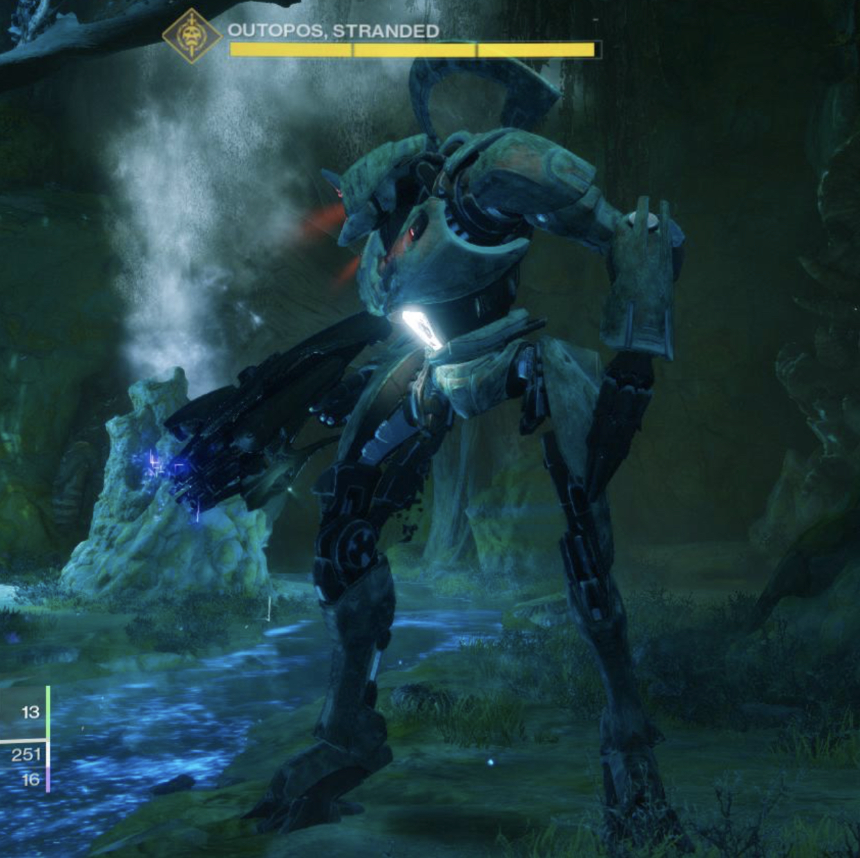 This image is a screenshot of a character or AI unit from the Destiny series of first-person shooter video games developed by Bungie Studios and published by Bungie or Activision. It falls under the screenshot category for a copyrighted computer game or video game, and the copyright for it is most likely held by the company that developed the game. It is believed that the use of a limited number of web-resolution screenshots: