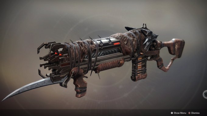 This image is a screenshot of a weapon from the Destiny series of first-person shooter video games developed by Bungie Studios and published by Bungie or Activision. It falls under the screenshot category for a copyrighted computer game or video game, and the copyright for it is most likely held by the company that developed the game. It is believed that the use of a limited number of web-resolution screenshots: