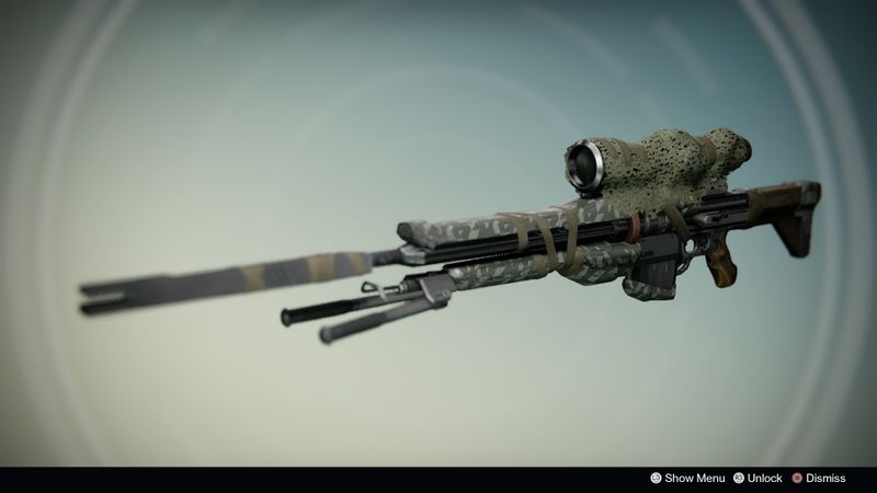 This image is a screenshot of a weapon from the Destiny series of first-person shooter video games developed by Bungie Studios and published by Bungie or Activision. It falls under the screenshot category for a copyrighted computer game or video game, and the copyright for it is most likely held by the company that developed the game. It is believed that the use of a limited number of web-resolution screenshots: