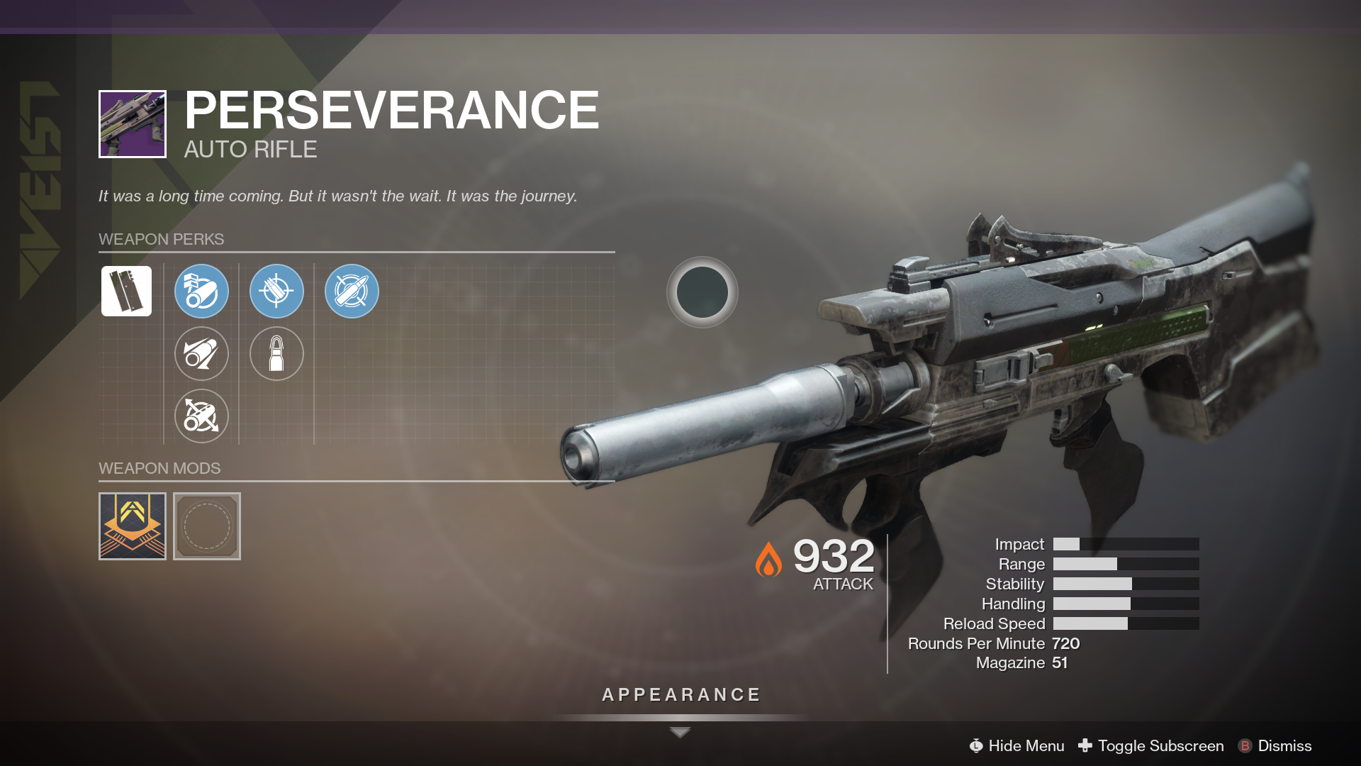 | current | 22:24, November 9, 2019 | 1,920 × 1,080 (1.42 MB) | Xveganrox (talk | contribs) | Perserverance Legendary Auto Rifle |