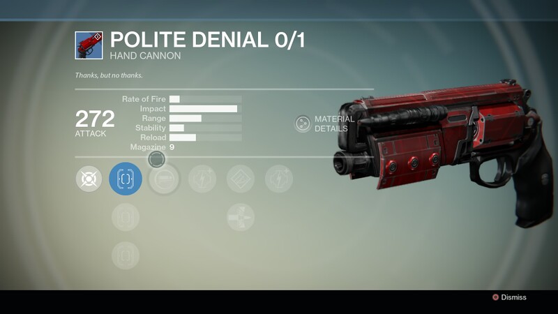 This image is a screenshot of a weapon from the Destiny series of first-person shooter video games developed by Bungie Studios and published by Bungie or Activision. It falls under the screenshot category for a copyrighted computer game or video game, and the copyright for it is most likely held by the company that developed the game. It is believed that the use of a limited number of web-resolution screenshots: