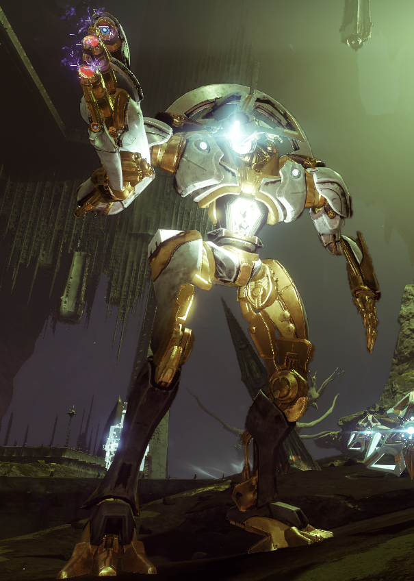 This image is a screenshot of a character or AI unit from the Destiny series of first-person shooter video games developed by Bungie Studios and published by Bungie or Activision. It falls under the screenshot category for a copyrighted computer game or video game, and the copyright for it is most likely held by the company that developed the game. It is believed that the use of a limited number of web-resolution screenshots: