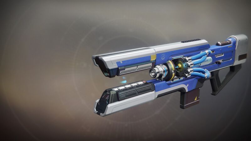 This image is a screenshot of a weapon from the Destiny series of first-person shooter video games developed by Bungie Studios and published by Bungie or Activision. It falls under the screenshot category for a copyrighted computer game or video game, and the copyright for it is most likely held by the company that developed the game. It is believed that the use of a limited number of web-resolution screenshots: