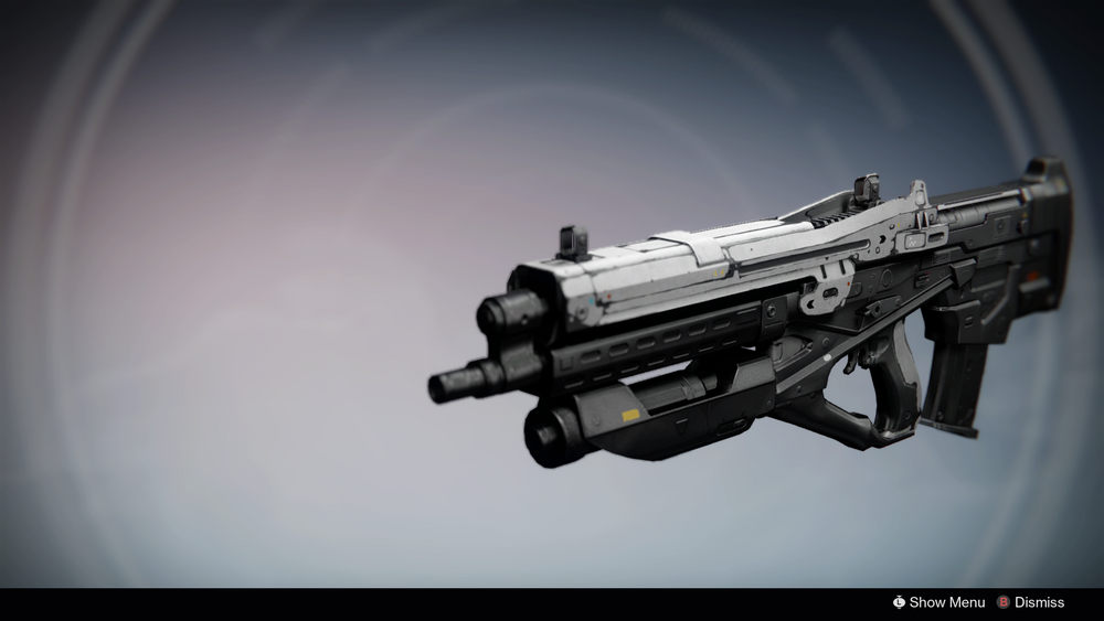 This image is a screenshot of a weapon from the Destiny series of first-person shooter video games developed by Bungie Studios and published by Bungie or Activision. It falls under the screenshot category for a copyrighted computer game or video game, and the copyright for it is most likely held by the company that developed the game. It is believed that the use of a limited number of web-resolution screenshots: