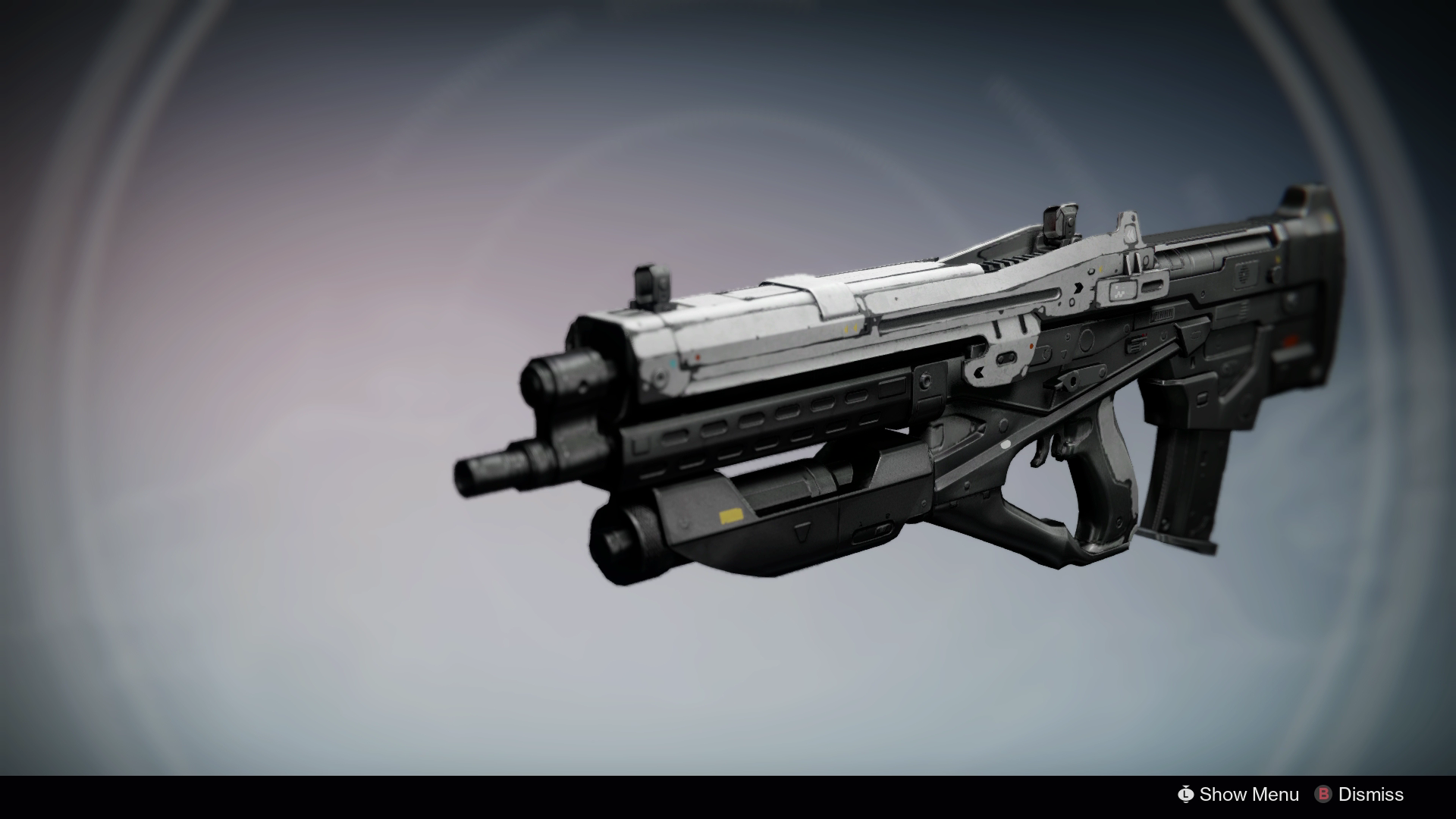 This image is a screenshot of a weapon from the Destiny series of first-person shooter video games developed by Bungie Studios and published by Bungie or Activision. It falls under the screenshot category for a copyrighted computer game or video game, and the copyright for it is most likely held by the company that developed the game. It is believed that the use of a limited number of web-resolution screenshots: