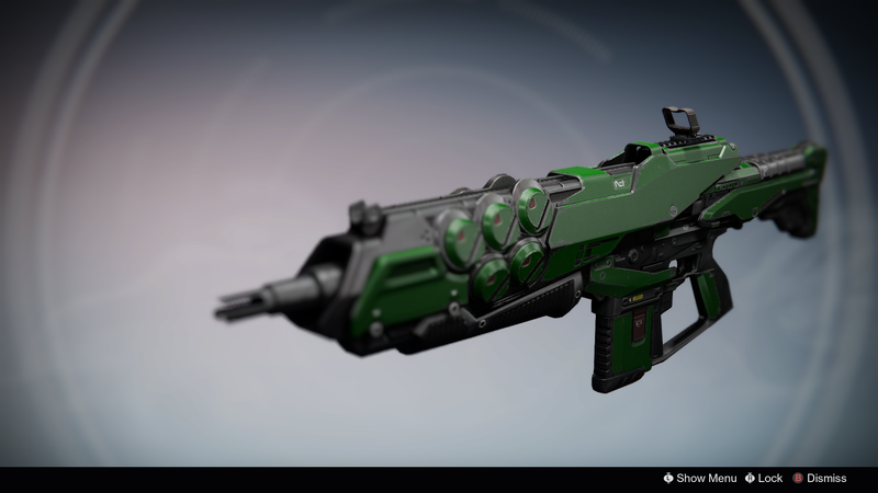 This image is a screenshot of a weapon from the Destiny series of first-person shooter video games developed by Bungie Studios and published by Bungie or Activision. It falls under the screenshot category for a copyrighted computer game or video game, and the copyright for it is most likely held by the company that developed the game. It is believed that the use of a limited number of web-resolution screenshots: