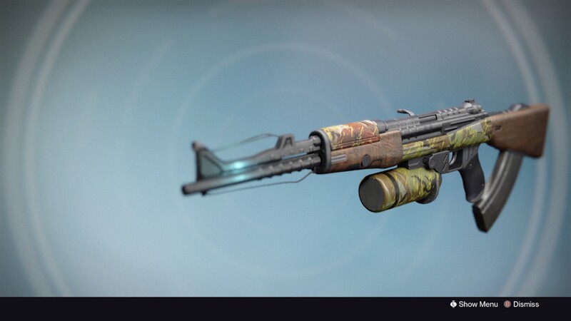 This image is a screenshot of a weapon from the Destiny series of first-person shooter video games developed by Bungie Studios and published by Bungie or Activision. It falls under the screenshot category for a copyrighted computer game or video game, and the copyright for it is most likely held by the company that developed the game. It is believed that the use of a limited number of web-resolution screenshots: