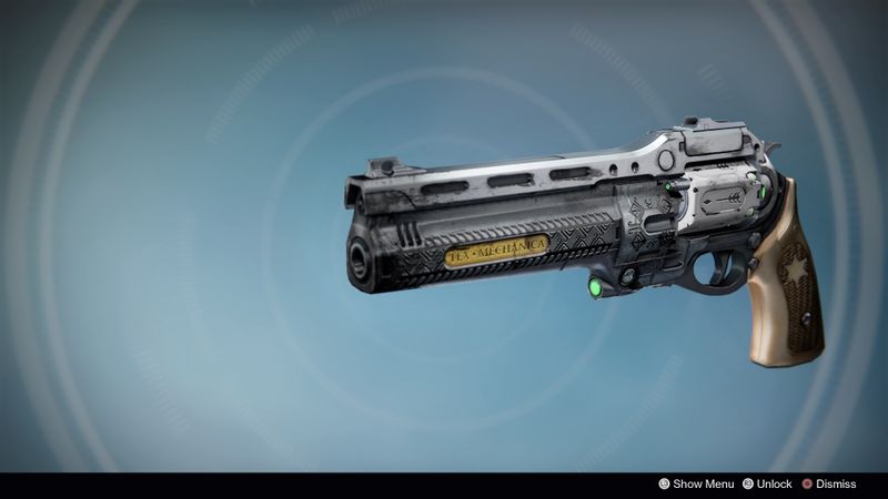 This image is a screenshot of a weapon from the Destiny series of first-person shooter video games developed by Bungie Studios and published by Bungie or Activision. It falls under the screenshot category for a copyrighted computer game or video game, and the copyright for it is most likely held by the company that developed the game. It is believed that the use of a limited number of web-resolution screenshots: