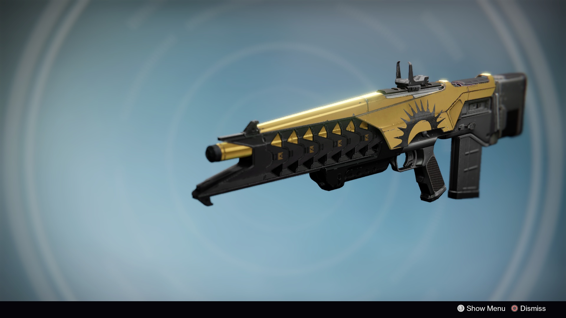 This image is a screenshot of a weapon from the Destiny series of first-person shooter video games developed by Bungie Studios and published by Bungie or Activision. It falls under the screenshot category for a copyrighted computer game or video game, and the copyright for it is most likely held by the company that developed the game. It is believed that the use of a limited number of web-resolution screenshots:
