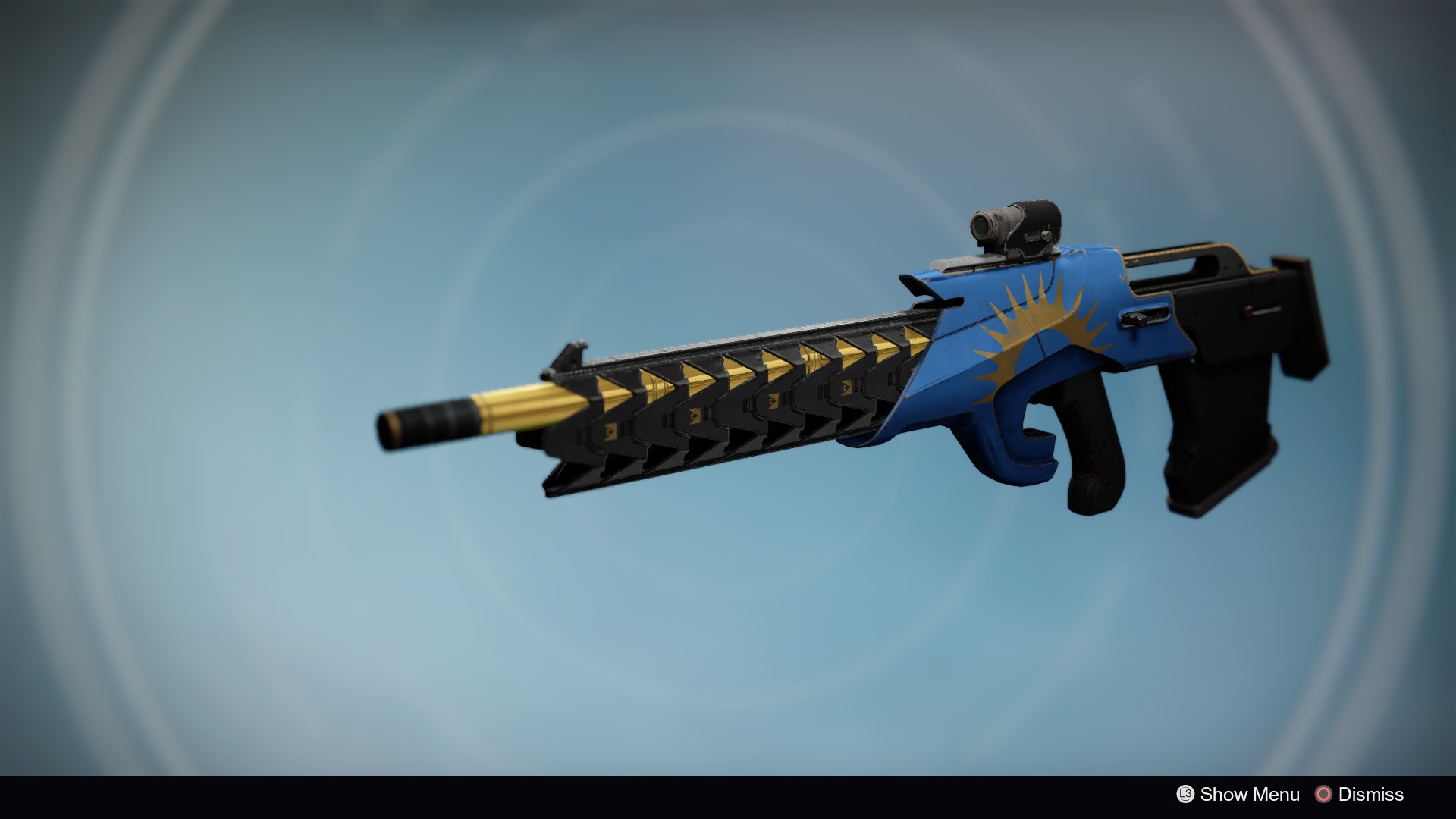 This image is a screenshot of a weapon from the Destiny series of first-person shooter video games developed by Bungie Studios and published by Bungie or Activision. It falls under the screenshot category for a copyrighted computer game or video game, and the copyright for it is most likely held by the company that developed the game. It is believed that the use of a limited number of web-resolution screenshots:
