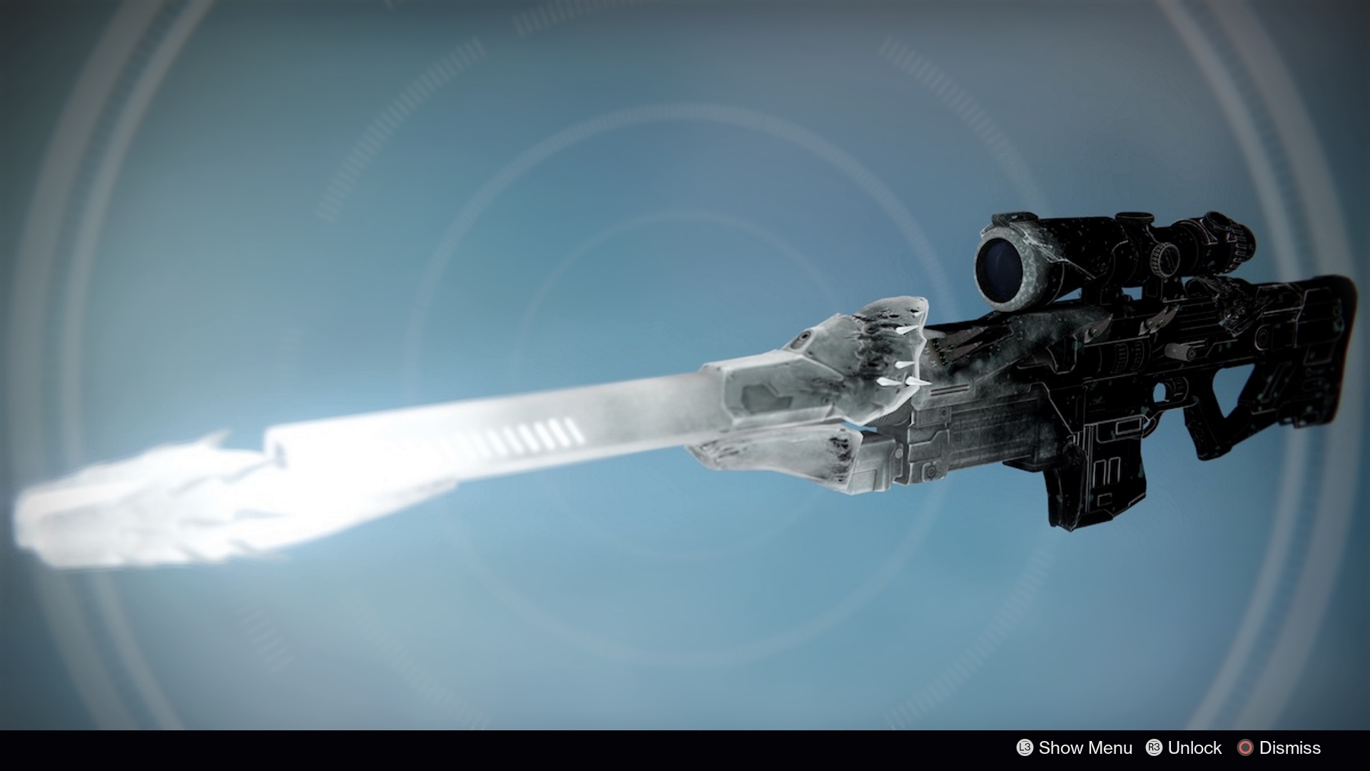 This image is a screenshot of a weapon from the Destiny series of first-person shooter video games developed by Bungie Studios and published by Bungie or Activision. It falls under the screenshot category for a copyrighted computer game or video game, and the copyright for it is most likely held by the company that developed the game. It is believed that the use of a limited number of web-resolution screenshots: