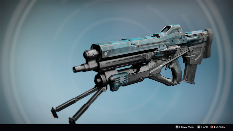 This image is a screenshot of a weapon from the Destiny series of first-person shooter video games developed by Bungie Studios and published by Bungie or Activision. It falls under the screenshot category for a copyrighted computer game or video game, and the copyright for it is most likely held by the company that developed the game. It is believed that the use of a limited number of web-resolution screenshots: