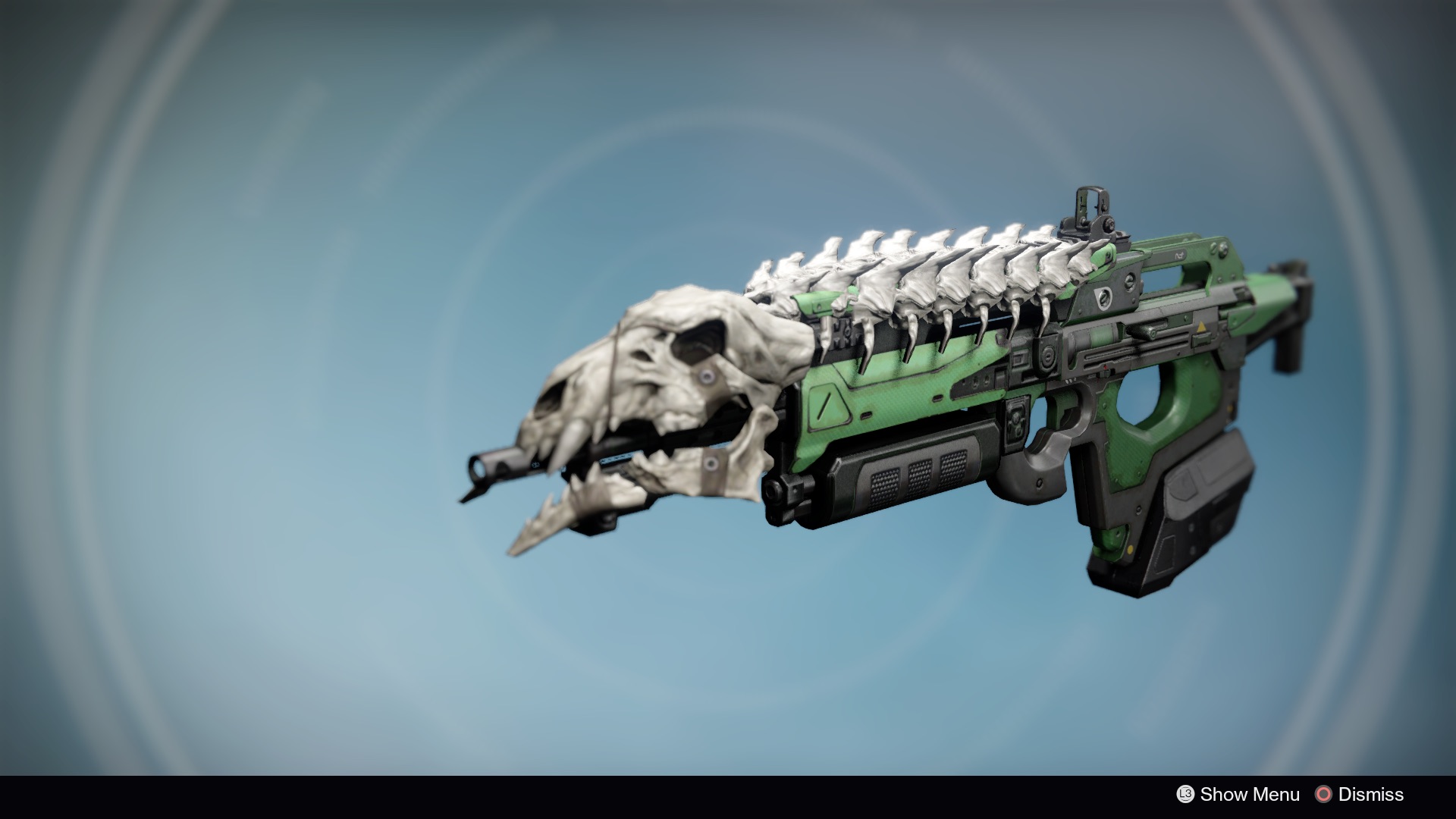 This image is a screenshot of a weapon from the Destiny series of first-person shooter video games developed by Bungie Studios and published by Bungie or Activision. It falls under the screenshot category for a copyrighted computer game or video game, and the copyright for it is most likely held by the company that developed the game. It is believed that the use of a limited number of web-resolution screenshots: