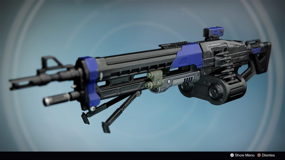This image is a screenshot of a weapon from the Destiny series of first-person shooter video games developed by Bungie Studios and published by Bungie or Activision. It falls under the screenshot category for a copyrighted computer game or video game, and the copyright for it is most likely held by the company that developed the game. It is believed that the use of a limited number of web-resolution screenshots: