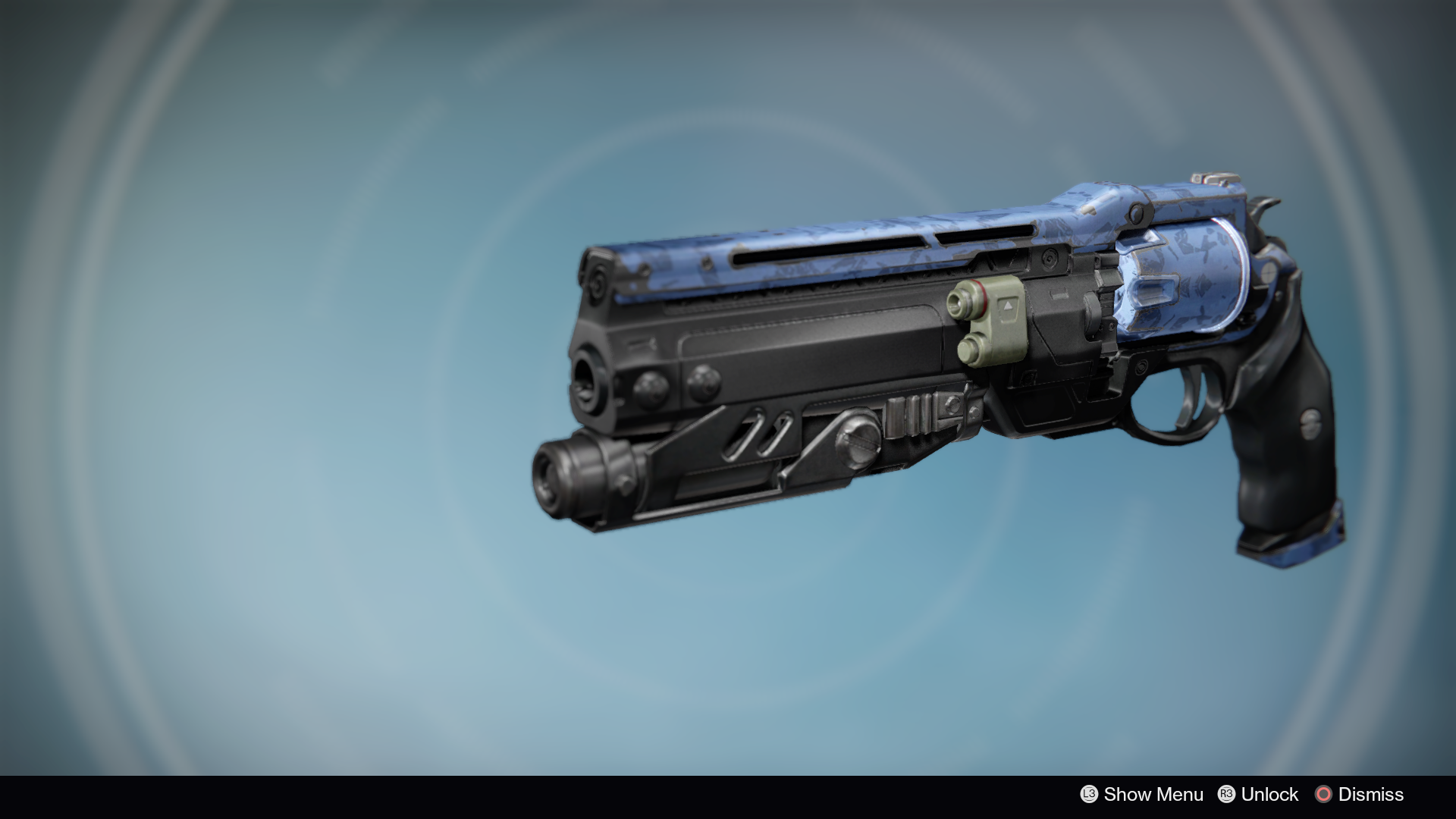 This image is a screenshot of a weapon from the Destiny series of first-person shooter video games developed by Bungie Studios and published by Bungie or Activision. It falls under the screenshot category for a copyrighted computer game or video game, and the copyright for it is most likely held by the company that developed the game. It is believed that the use of a limited number of web-resolution screenshots:
