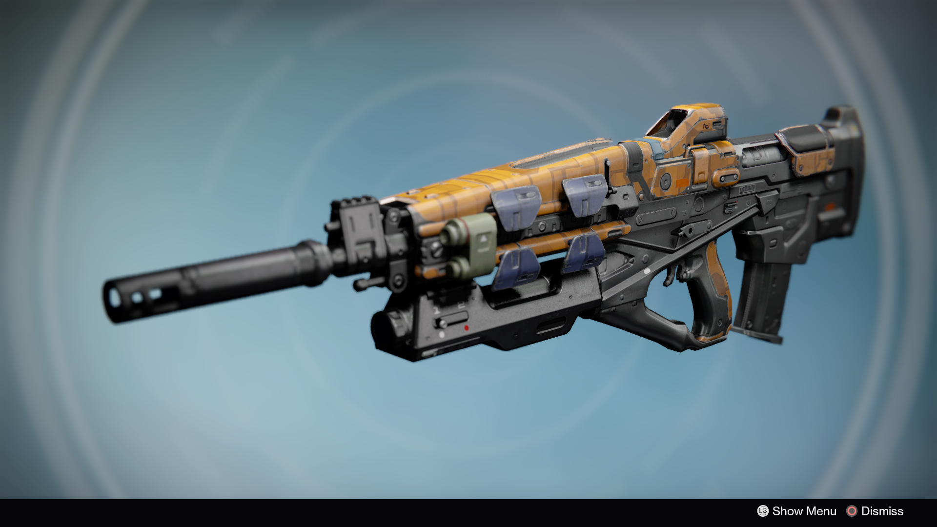 This image is a screenshot of a weapon from the Destiny series of first-person shooter video games developed by Bungie Studios and published by Bungie or Activision. It falls under the screenshot category for a copyrighted computer game or video game, and the copyright for it is most likely held by the company that developed the game. It is believed that the use of a limited number of web-resolution screenshots: