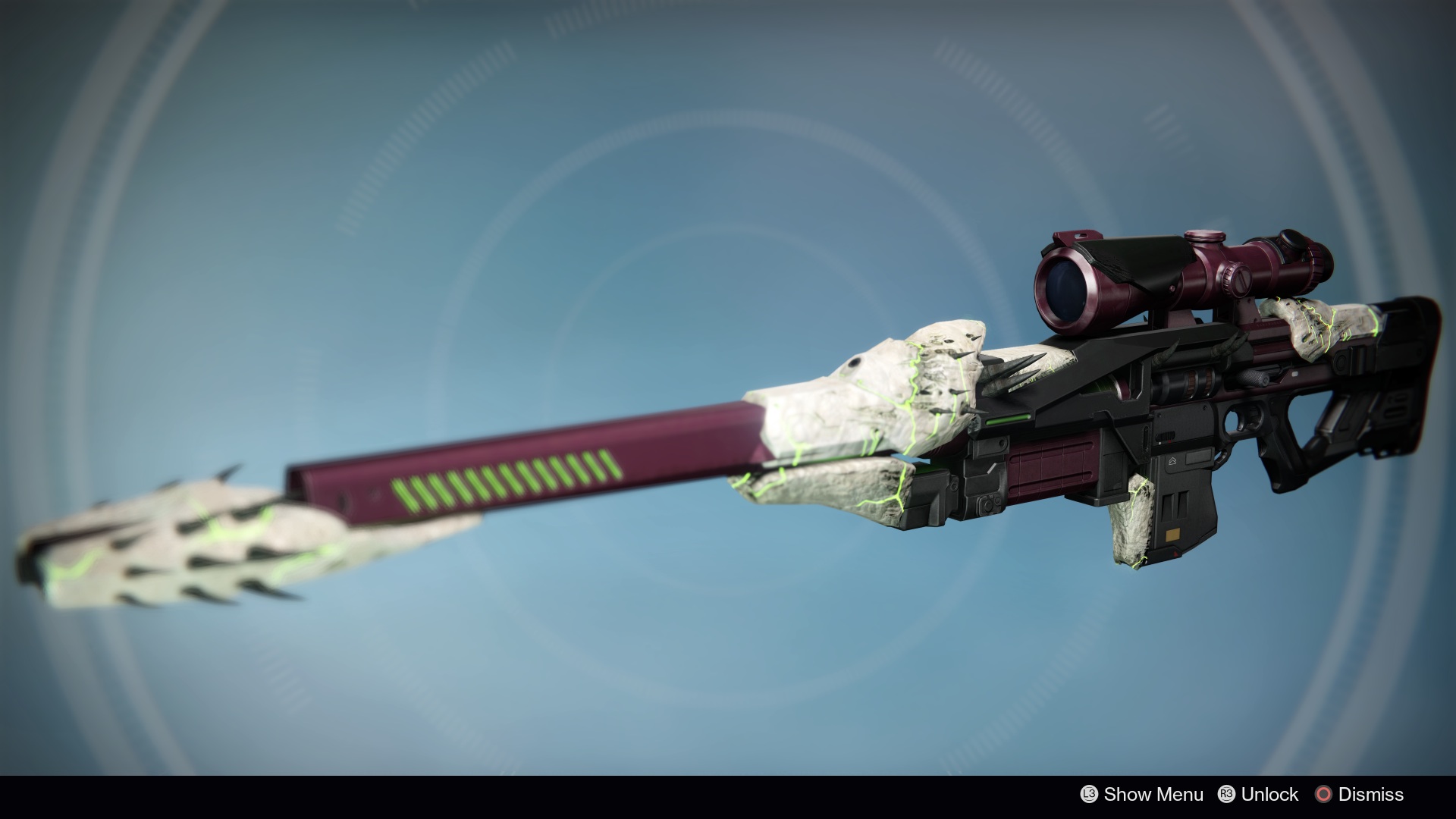 This image is a screenshot of a weapon from the Destiny series of first-person shooter video games developed by Bungie Studios and published by Bungie or Activision. It falls under the screenshot category for a copyrighted computer game or video game, and the copyright for it is most likely held by the company that developed the game. It is believed that the use of a limited number of web-resolution screenshots: