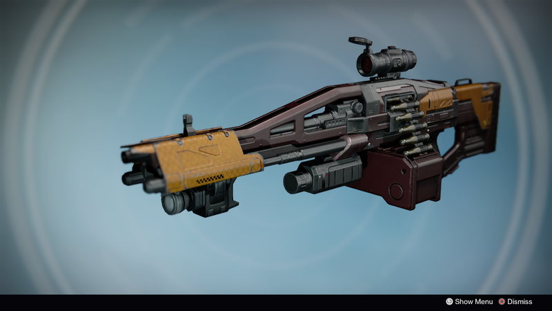 This image is a screenshot of a weapon from the Destiny series of first-person shooter video games developed by Bungie Studios and published by Bungie or Activision. It falls under the screenshot category for a copyrighted computer game or video game, and the copyright for it is most likely held by the company that developed the game. It is believed that the use of a limited number of web-resolution screenshots: