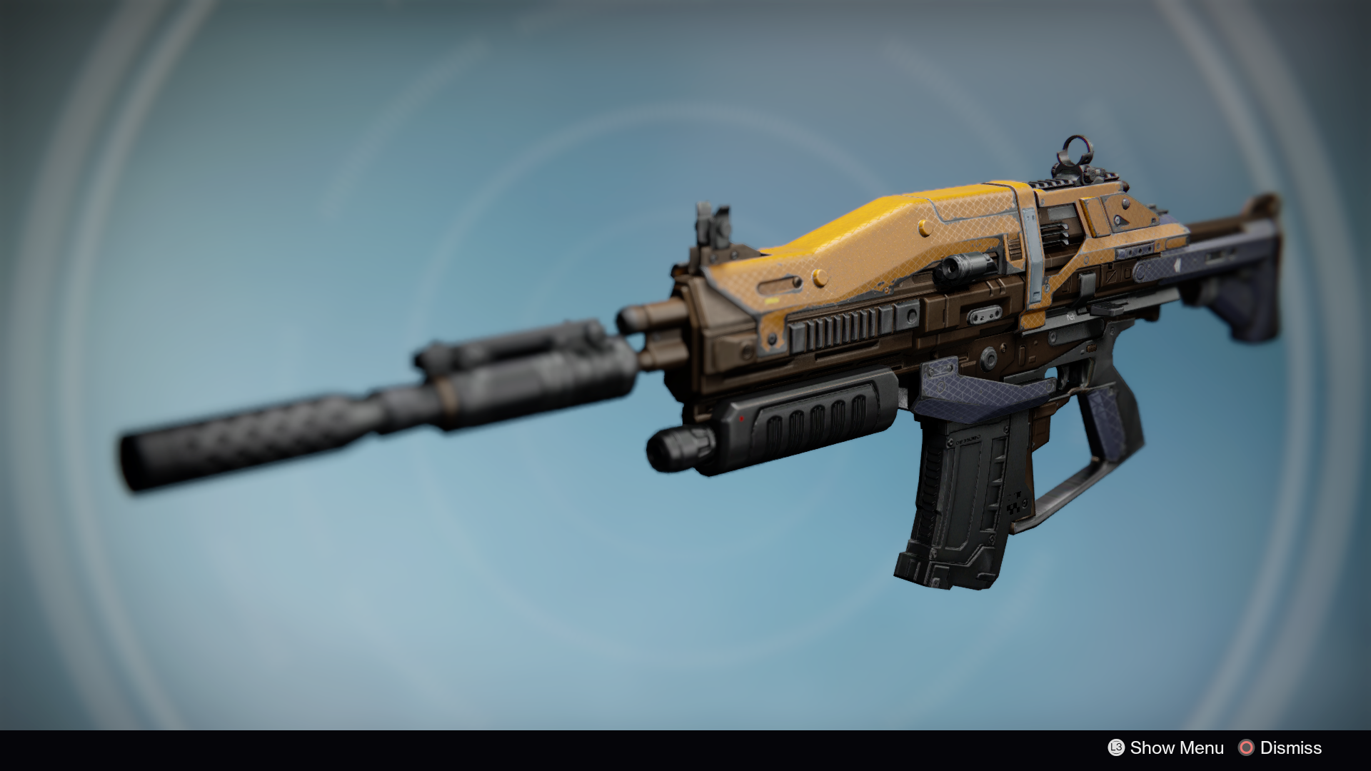 This image is a screenshot of a weapon from the Destiny series of first-person shooter video games developed by Bungie Studios and published by Bungie or Activision. It falls under the screenshot category for a copyrighted computer game or video game, and the copyright for it is most likely held by the company that developed the game. It is believed that the use of a limited number of web-resolution screenshots: