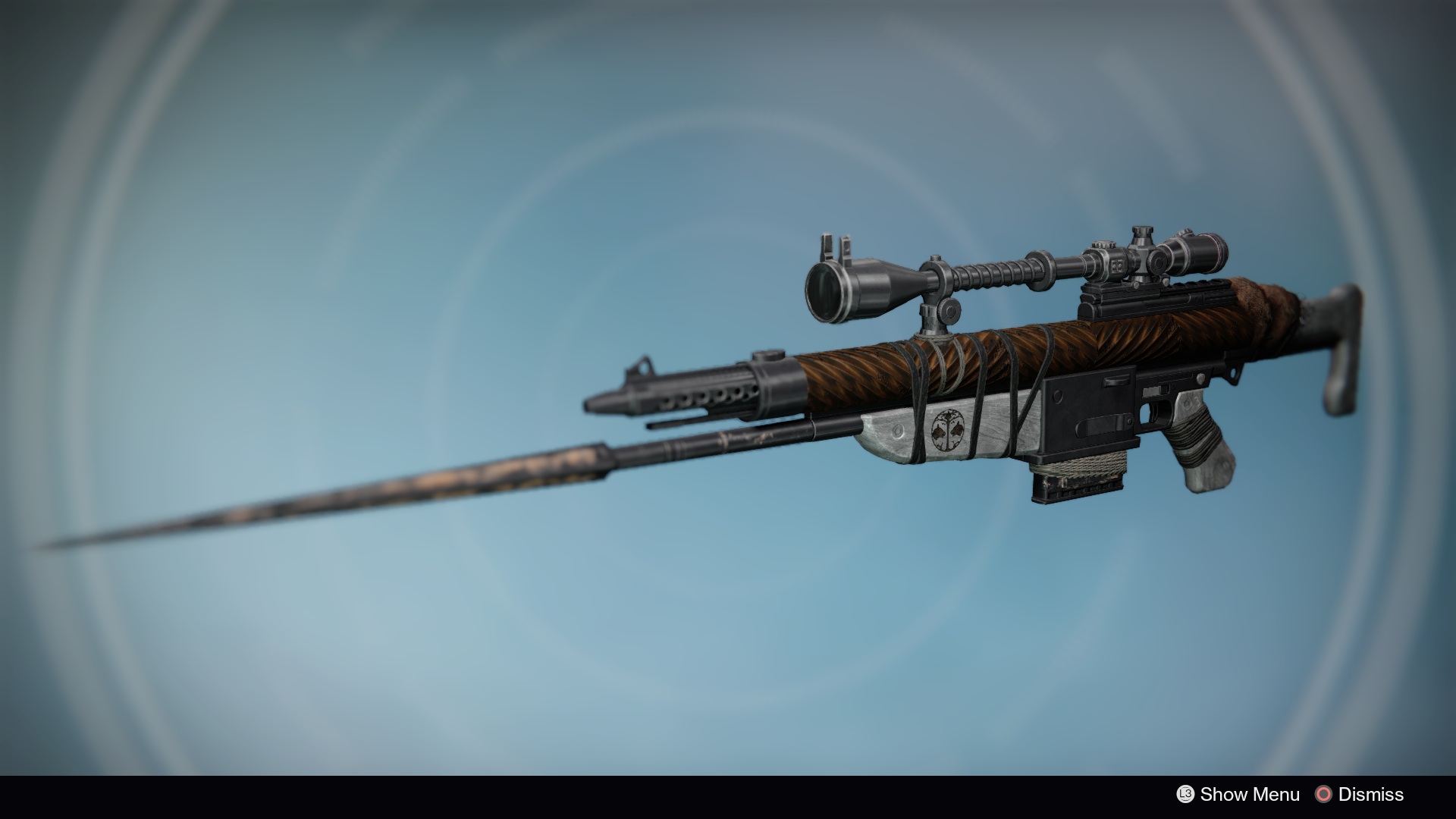 This image is a screenshot of a weapon from the Destiny series of first-person shooter video games developed by Bungie Studios and published by Bungie or Activision. It falls under the screenshot category for a copyrighted computer game or video game, and the copyright for it is most likely held by the company that developed the game. It is believed that the use of a limited number of web-resolution screenshots: