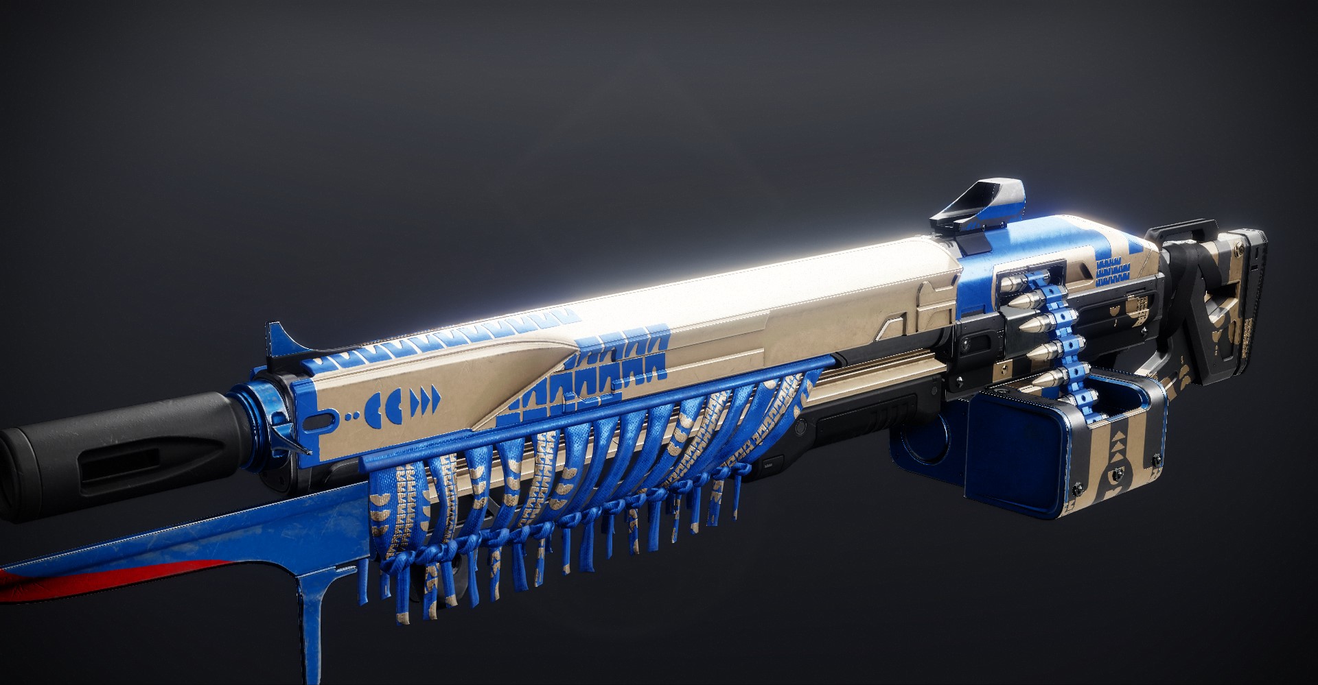 This image is a screenshot of a weapon from the Destiny series of first-person shooter video games developed by Bungie Studios and published by Bungie or Activision. It falls under the screenshot category for a copyrighted computer game or video game, and the copyright for it is most likely held by the company that developed the game. It is believed that the use of a limited number of web-resolution screenshots: