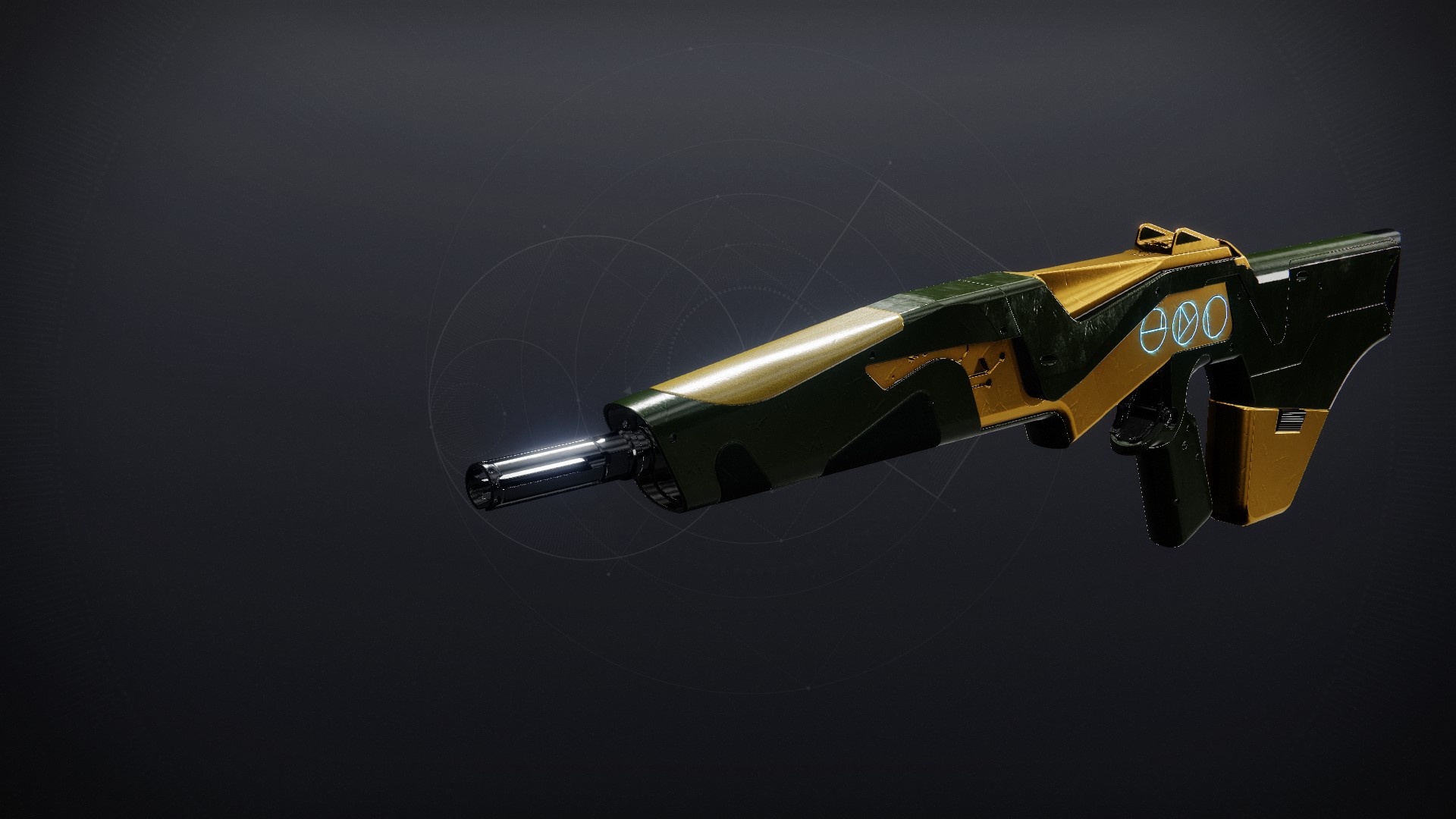 This image is a screenshot of a weapon from the Destiny series of first-person shooter video games developed by Bungie Studios and published by Bungie or Activision. It falls under the screenshot category for a copyrighted computer game or video game, and the copyright for it is most likely held by the company that developed the game. It is believed that the use of a limited number of web-resolution screenshots: