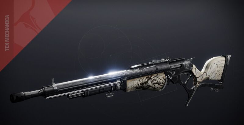 This image is a screenshot of a weapon from the Destiny series of first-person shooter video games developed by Bungie Studios and published by Bungie or Activision. It falls under the screenshot category for a copyrighted computer game or video game, and the copyright for it is most likely held by the company that developed the game. It is believed that the use of a limited number of web-resolution screenshots: