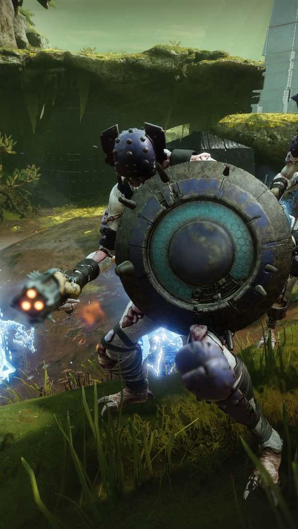 This image is a screenshot of a character or AI unit from the Destiny series of first-person shooter video games developed by Bungie Studios and published by Bungie or Activision. It falls under the screenshot category for a copyrighted computer game or video game, and the copyright for it is most likely held by the company that developed the game. It is believed that the use of a limited number of web-resolution screenshots:
