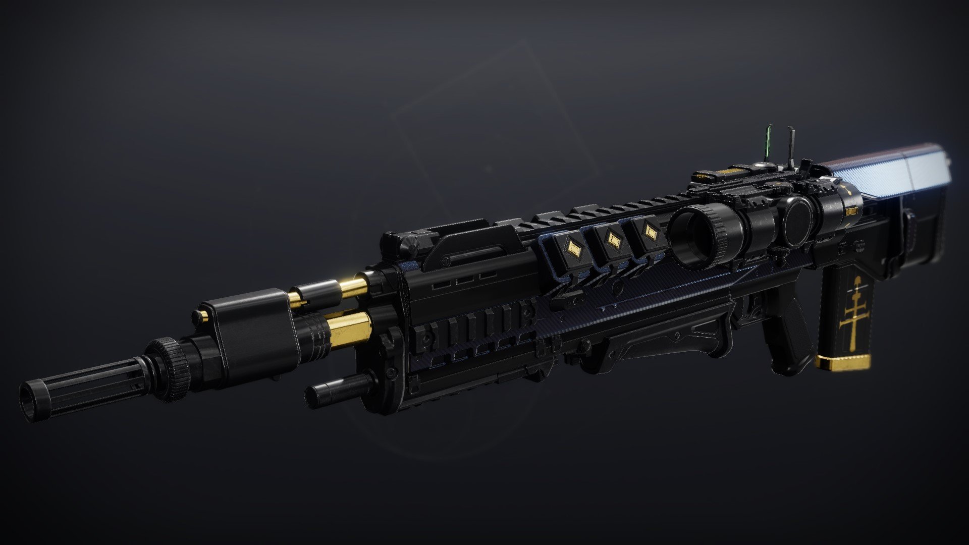 This image is a screenshot of a weapon from the Destiny series of first-person shooter video games developed by Bungie Studios and published by Bungie or Activision. It falls under the screenshot category for a copyrighted computer game or video game, and the copyright for it is most likely held by the company that developed the game. It is believed that the use of a limited number of web-resolution screenshots: