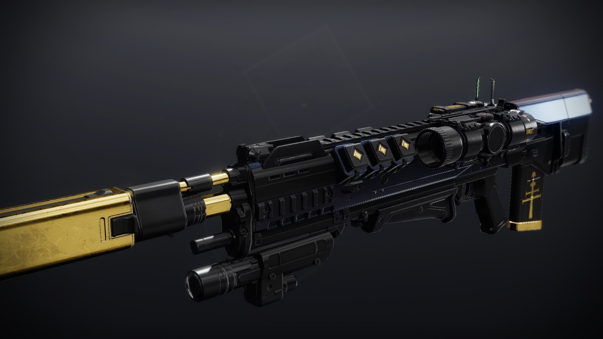 This image is a screenshot of a weapon from the Destiny series of first-person shooter video games developed by Bungie Studios and published by Bungie or Activision. It falls under the screenshot category for a copyrighted computer game or video game, and the copyright for it is most likely held by the company that developed the game. It is believed that the use of a limited number of web-resolution screenshots: