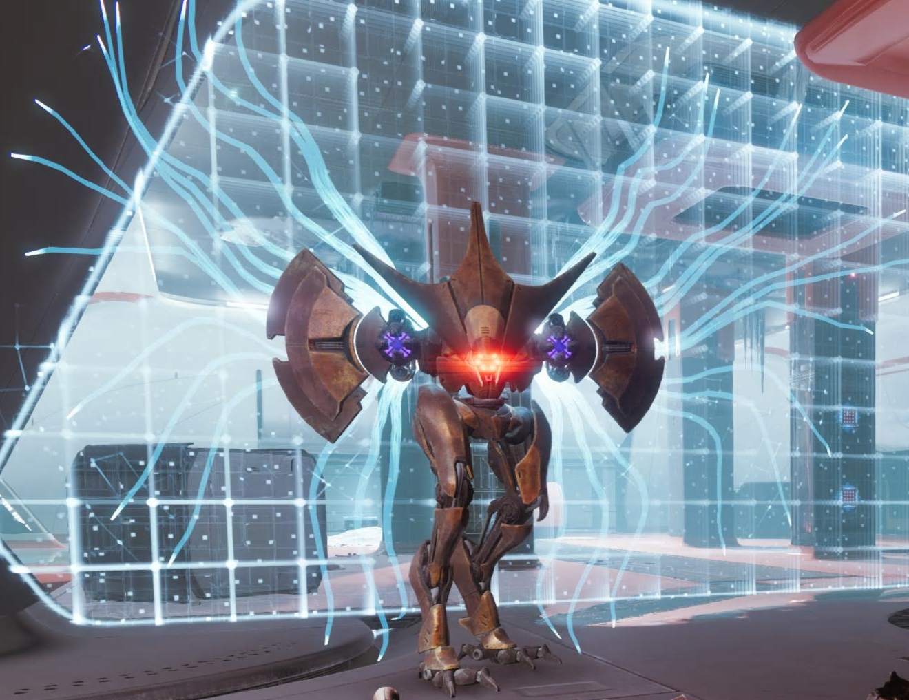 This image is a screenshot of a character or AI unit from the Destiny series of first-person shooter video games developed by Bungie Studios and published by Bungie or Activision. It falls under the screenshot category for a copyrighted computer game or video game, and the copyright for it is most likely held by the company that developed the game. It is believed that the use of a limited number of web-resolution screenshots: