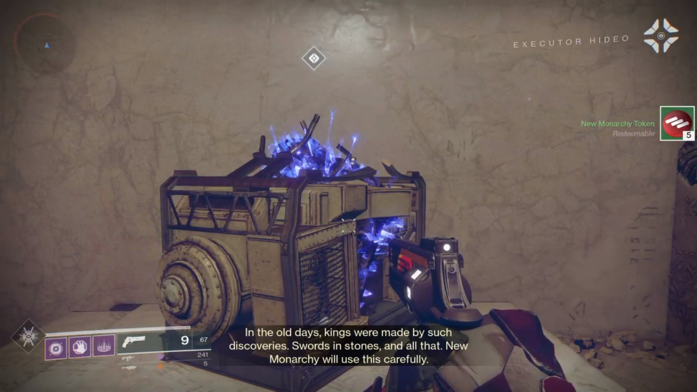 Executor Hideo': "In the old days, kings were made by such discoveries. Swords in stones, and all that. New Monarchy will use this carefully."